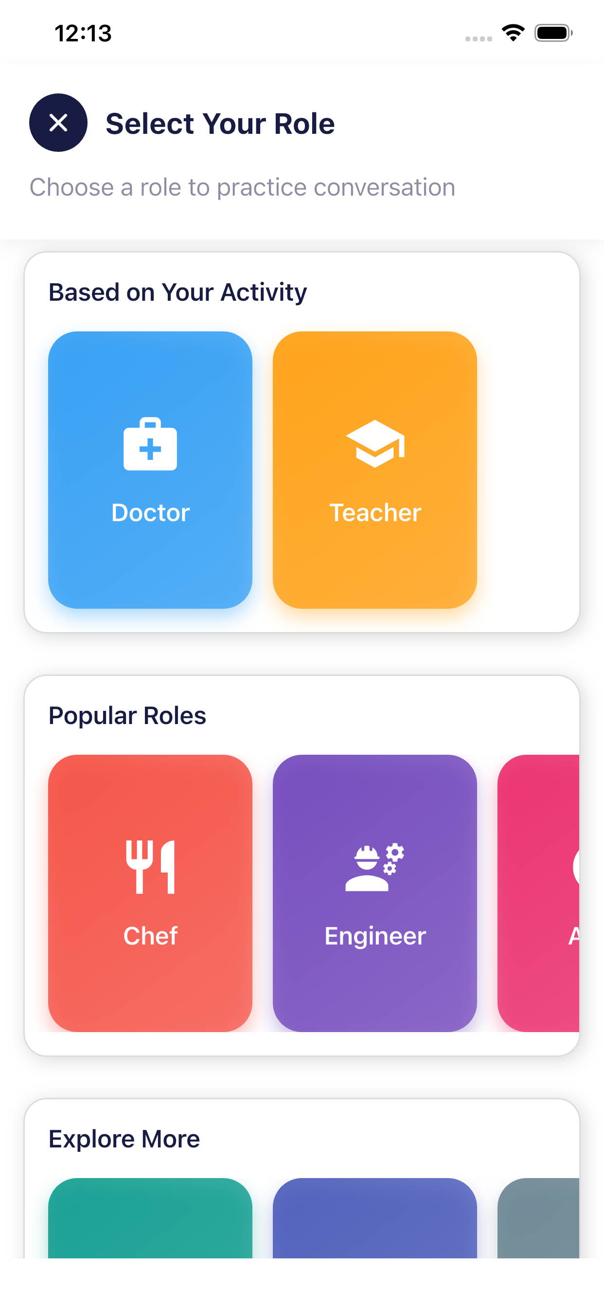 Students can practice conversations by selecting different real-life roles such as teacher, doctor, chef, engineer, and more.
