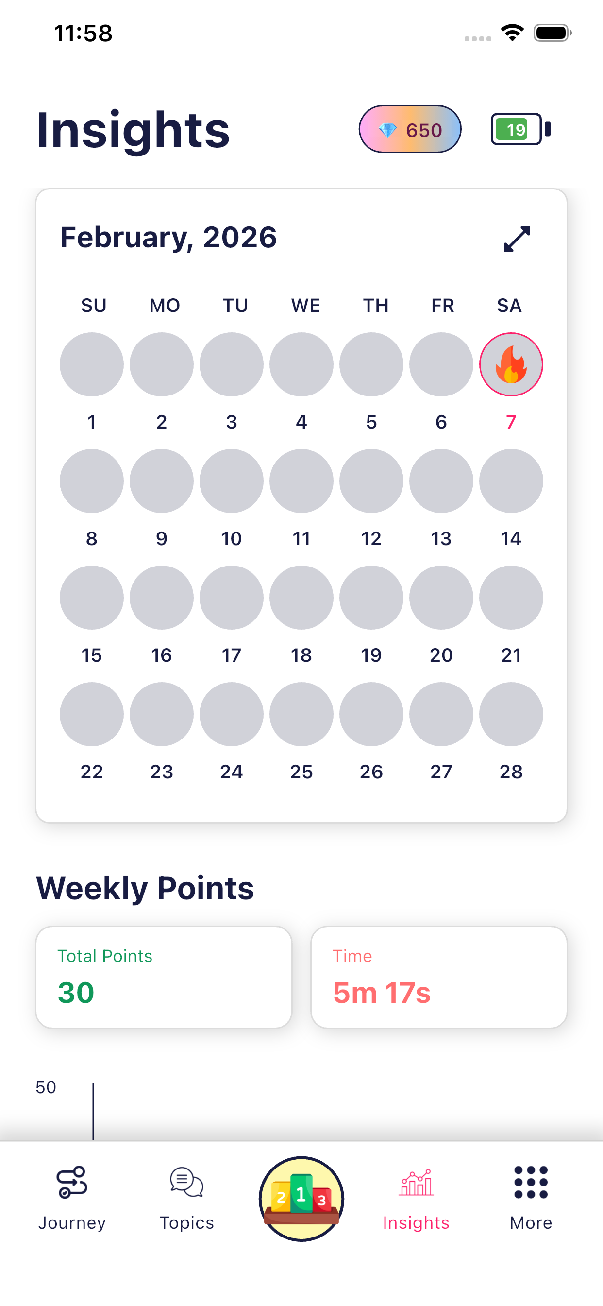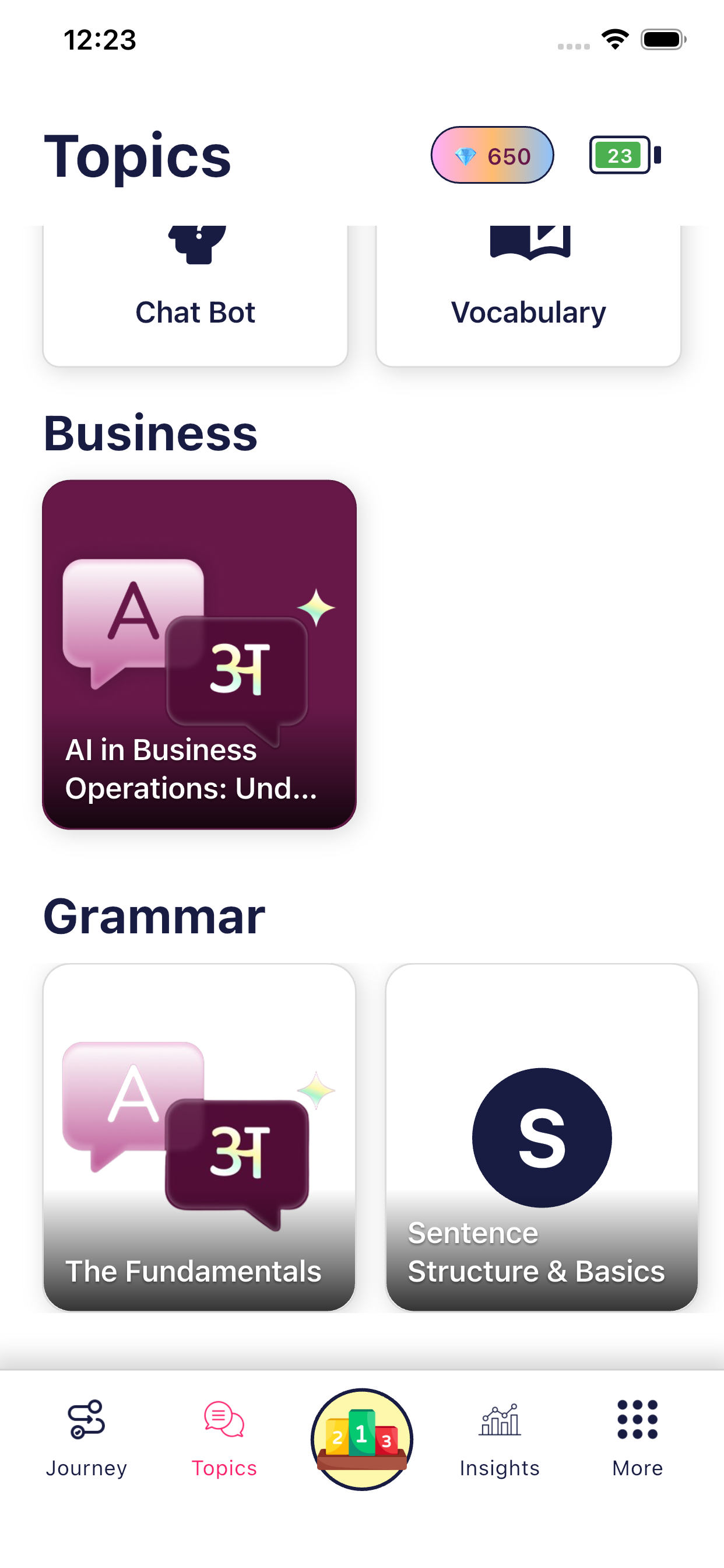 The Topics module allows students to learn specific subjects in a structured and guided way, with related content, explanations, and quizzes.