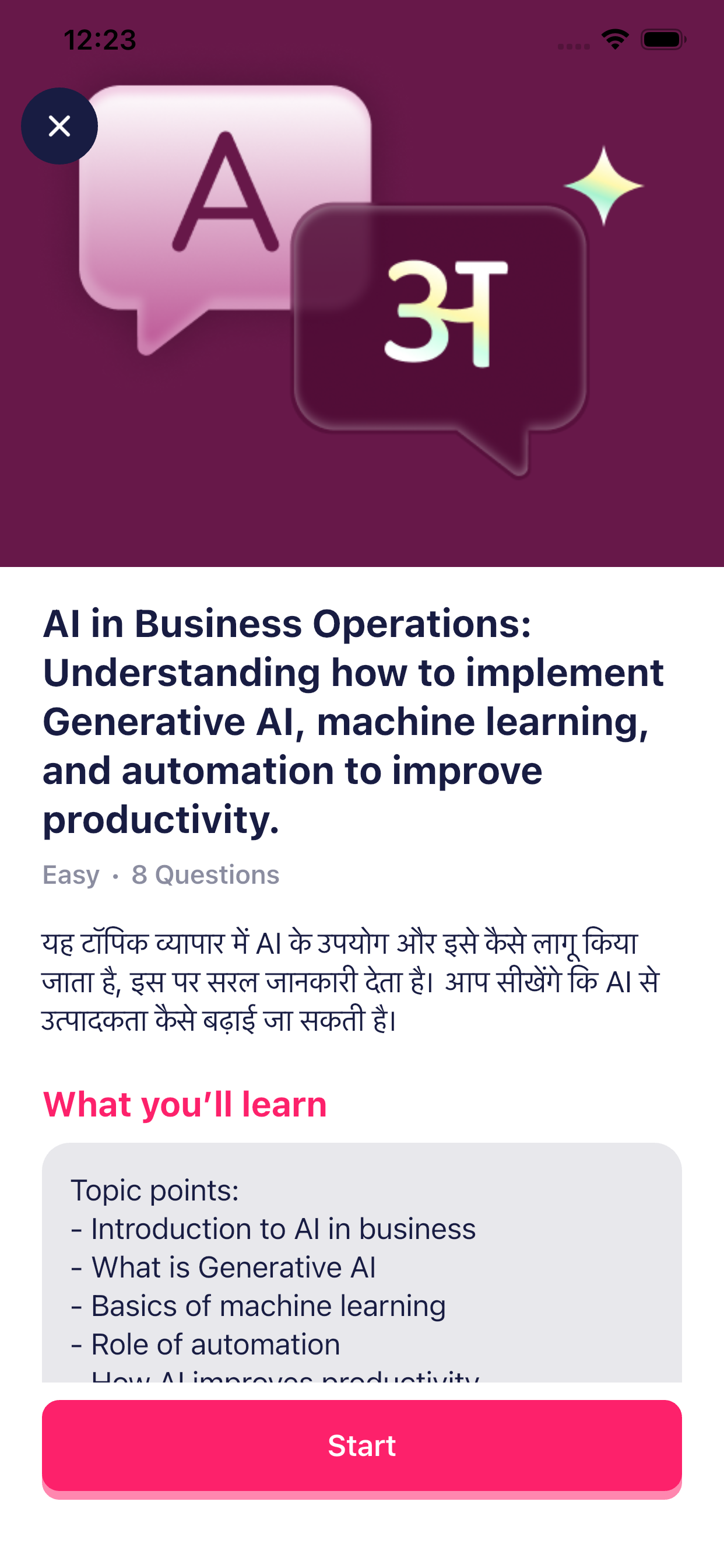 The Topic Detail screen provides complete information about the selected topic before starting.