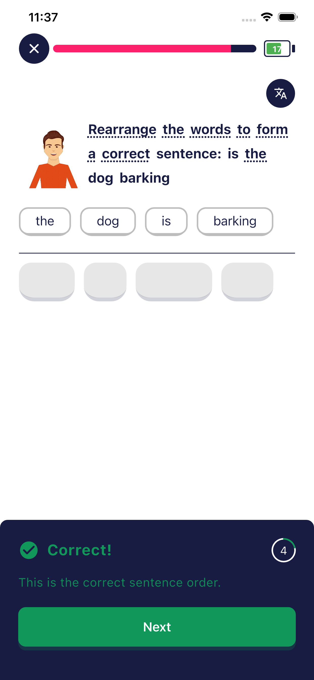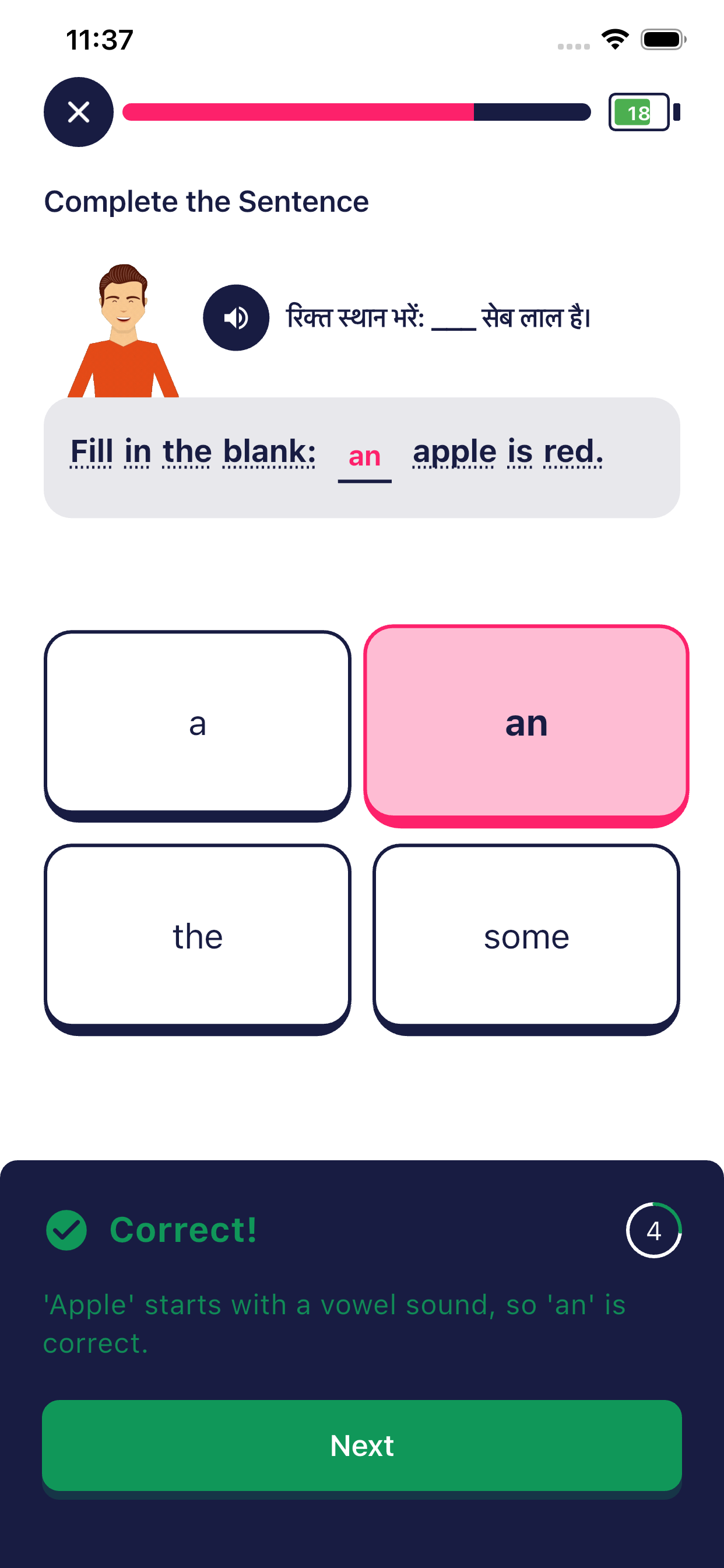 The chatbot responds intelligently, guiding students to form correct sentences and use appropriate vocabulary.