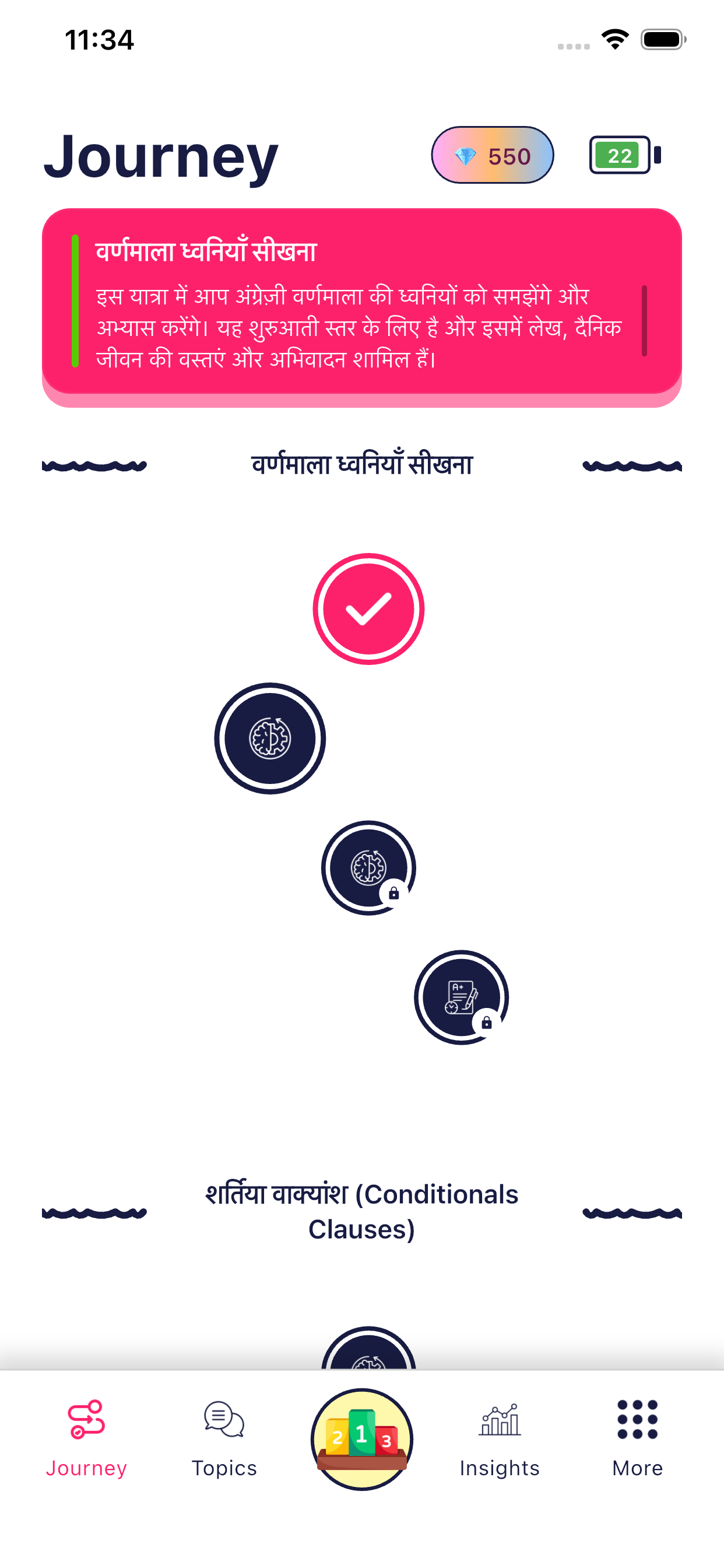 The Topics module allows students to learn specific subjects in a structured and guided way, with related content, explanations, and quizzes.